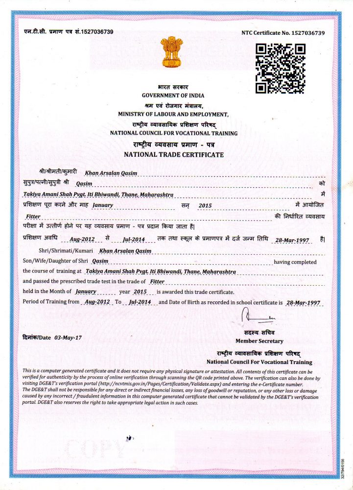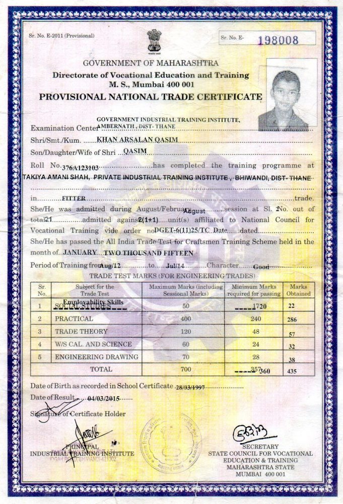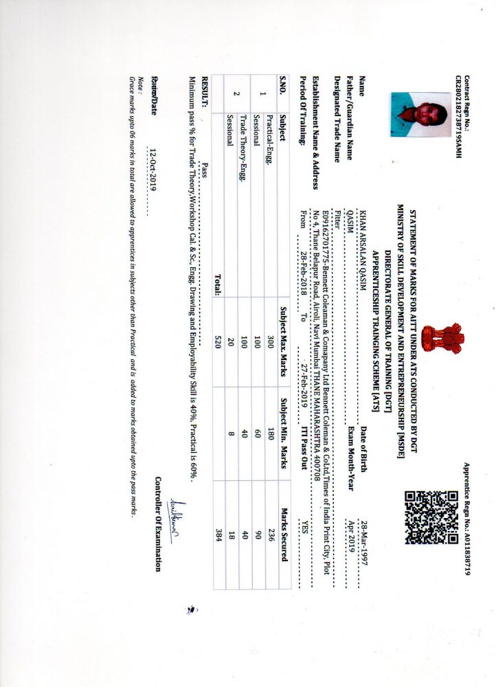 KHAN ARSALAN QASIM Passport No. P6790676 572, Eidgah Road, Near Ravish Kirana, Bhiwandi, Dist. Thane - 421302 Contact no: - 7040104946 E-mail Id:- arsalankhan704010@gmail.com   OBJECTIVES:   To pursue a career with an organization which will help me explore my potential and achieve expertise, Handling New opportunities, Tackling challenges, and delivering my best for the organization.     PERSONAL DETAILS:   Date of Birth : 28th March 1997 Marital Status : Single Religion : Muslim Nationality : Indian Gender : Male Languages : English, Urdu & Hindi   EDUCACTIONAL QUALIFICATION   SSC Maharashtra State Board 2012 60%   ITI (Fitter) DVET 2015 62%   Apprenticeship Times Of india Airoli 2019 73%     COMPUTER KNOWLEDGE:   MS-CIT Excel WORK EXPERIENCE:   Worked in Time of India as a Ferag Department Maintenance Line for 1 Year Avlock International india private limited(Assembly and Oprating Revit Machine)Hydrapac Maintainace and Assmbly and dispatched DOJ Avlock International India Privat Limited (25/11/2019) To( 24/11/2021) NCVT passed in Times Of india DOJ (28/02/2018) To (28/02/2019) DECLARATION:   I hereby declare that all the above information is correct to the best of my knowledge and belief.     Date:- Place:-Bhiwandi KHAN ARSALAN QASIM